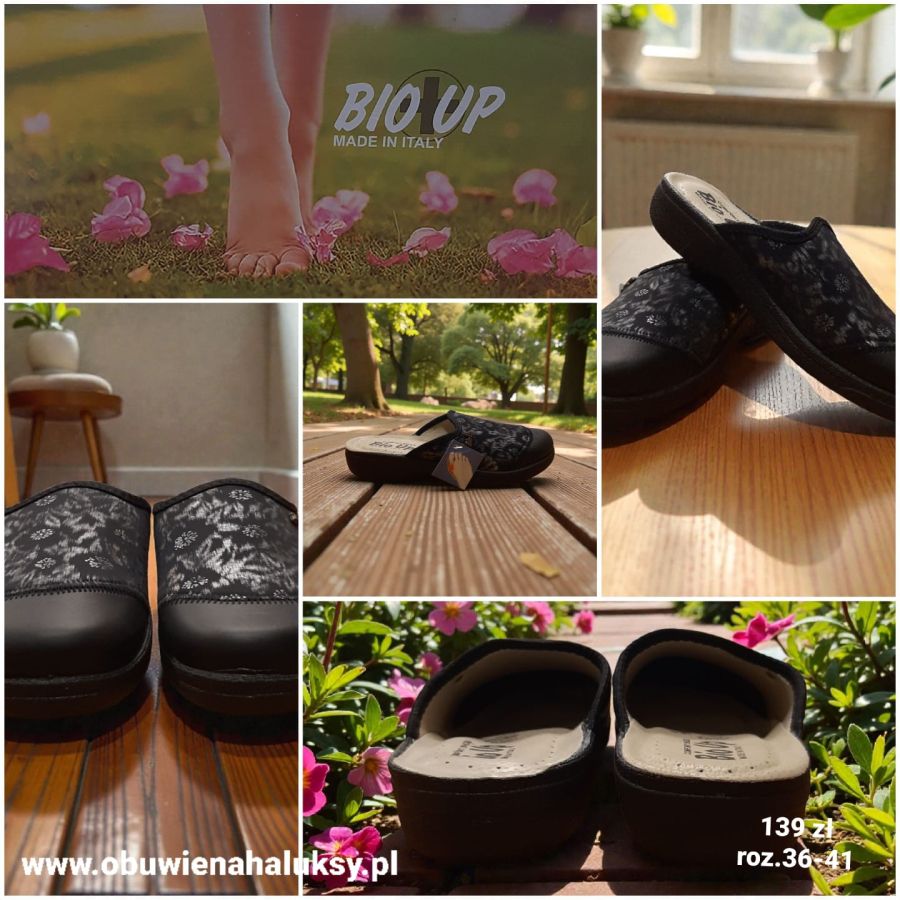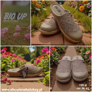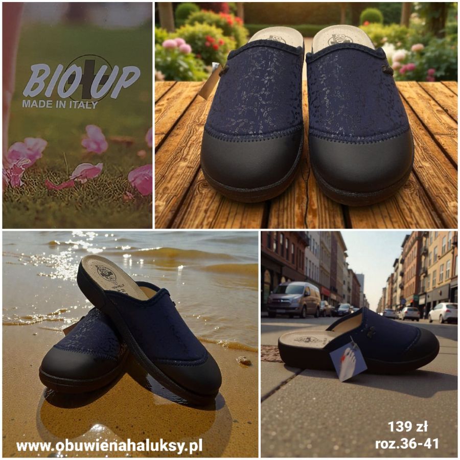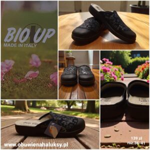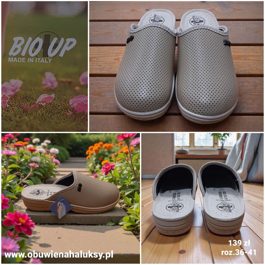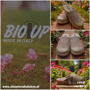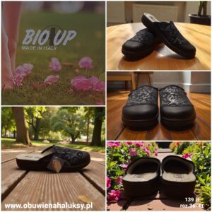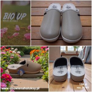 Bio Up włoskie obuwie na haluksy, przykostki, opuchnięte, cukrzycowe obolałe stopy z pełnym przodem. Obuwie o bardzo dużej rozciągliwości z domieszką laykry. Wewnątrz posiadają skórzane, miękkie wkładki. Spody antypoślizgowe.