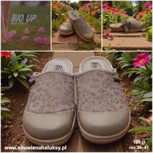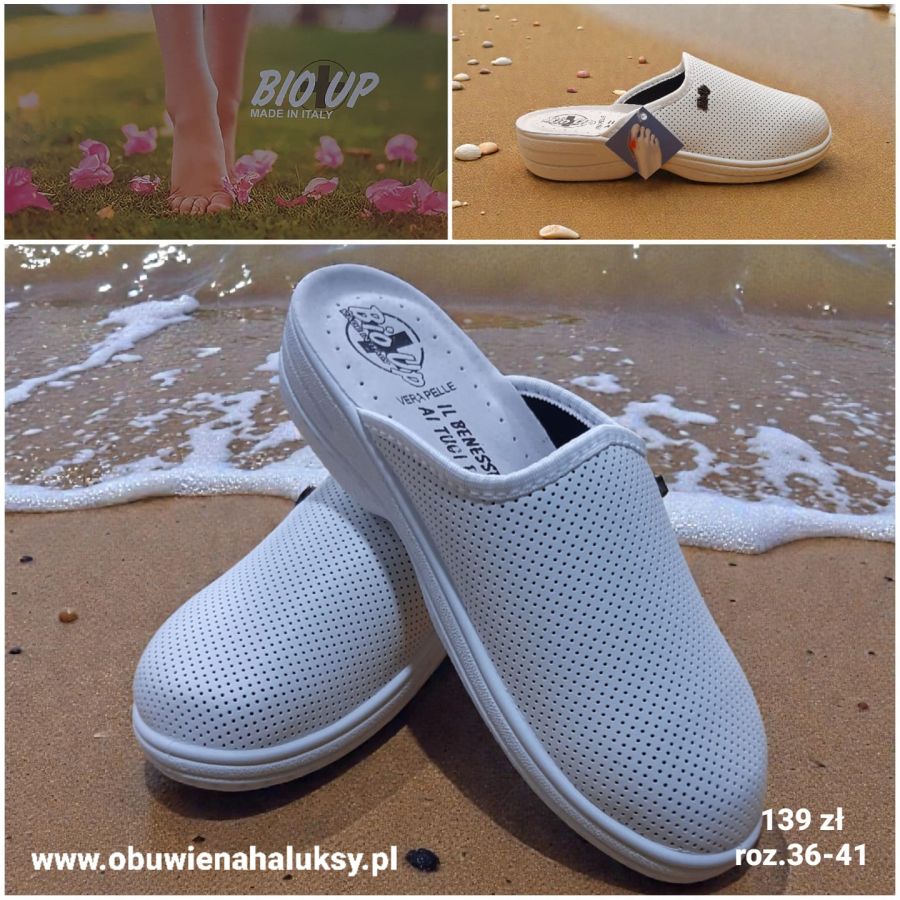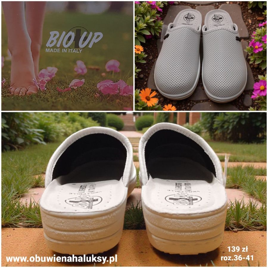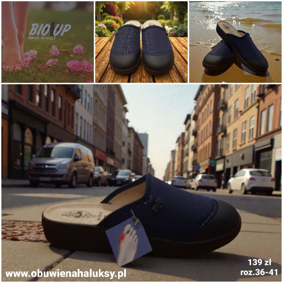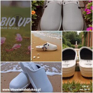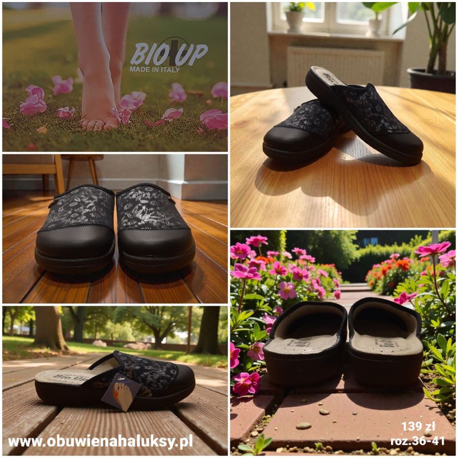 Bio Up włoskie obuwie na haluksy, przykostki, opuchnięte, cukrzycowe obolałe stopy z pełnym przodem. Obuwie o bardzo dużej rozciągliwości z domieszką laykry. Wewnątrz posiadają skórzane, miękkie wkładki. Spody antypoślizgowe.